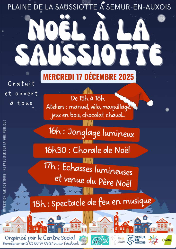 Le Centre Social de Semur-en-Auxois organise Noël à la Saussiotte Mercredi 17 décembre 2025 de 15h à 18h. De nombreuses animations et spectacles gratuits vous attendent.